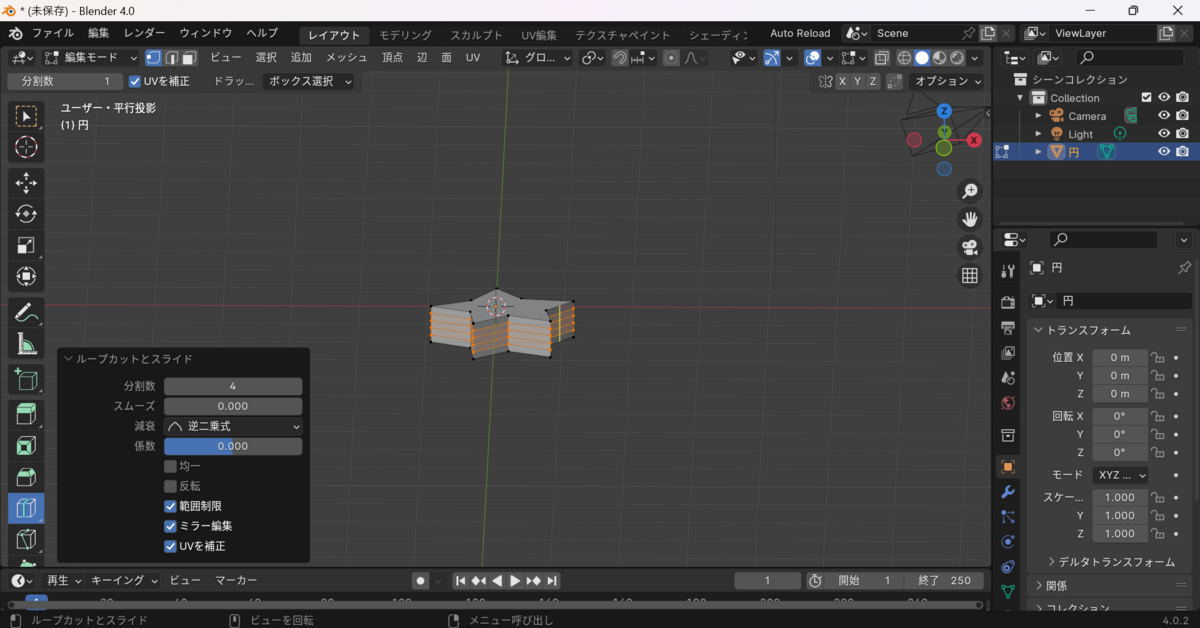 この段階で押し出すなら、Z軸の正の方向にするべきだったのです。画像では下に押し出している(新たに押し出された面がオレンジ色になっています)のに対し、上の面を新たに押し出すべきでした。これにより、スケールが逆転。メッシュの本来あってほしい内側が外側に、外側が内側になっている状態だったわけです。